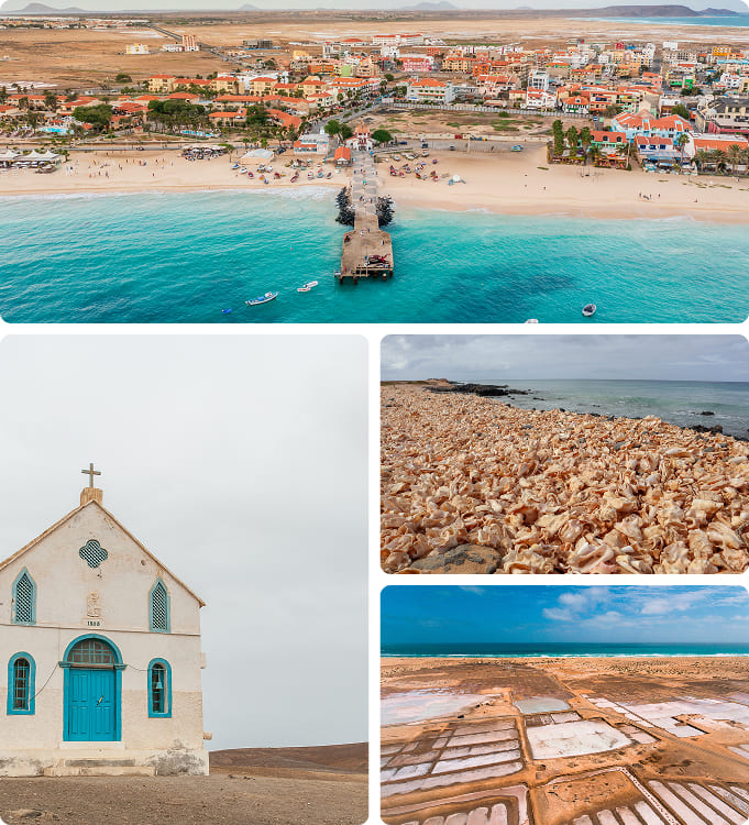 Santa María es el alma de la isla, con su playa interminable y su muelle lleno de vida. Pedra de Lume sorprende con sus salinas dentro de un cráter, donde flotar sin esfuerzo es una experiencia única. Buracona, con su famoso Ojo Azul, muestra uno de los paisajes naturales más llamativos de Cabo Verde. Y si te apetece ver la vida cotidiana, Espargos y Palmeira ofrecen un ambiente local auténtico y tranquilo.
